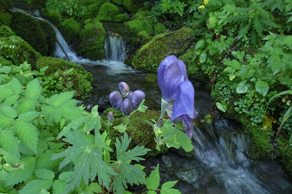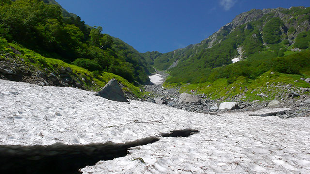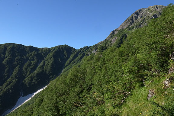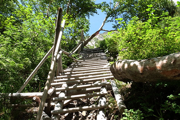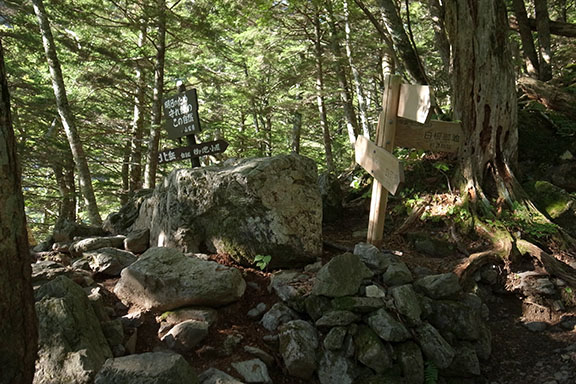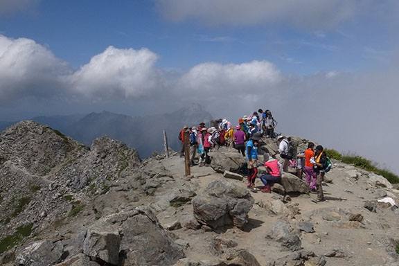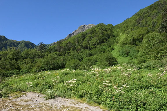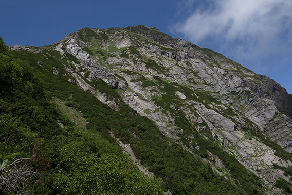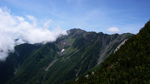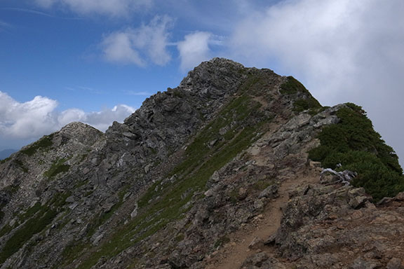 大樺沢(おおかんばさわ)沿いのコースは先日までは雪渓に覆われていたようだが、このところの猛暑で大部分の雪渓は解けてしまったようだ.このコースは谷沢に沿って登って行くとても心地良いコースで、暑い日には打って付けのコースだ.二俣から左にコースを取り八本歯のコルと呼ばれる稜線の鞍部に出るコースなのだが、稜線のコルまではこれでもかという具合に梯子が続き嫌になってしまう.のんびりと時間を潰しながら稜線をトコトコと登って行くが、周辺は段々とガスに覆われるようになりあまり視界は良くなかった.