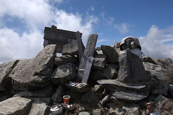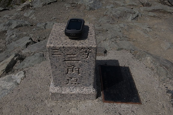 北岳の頂上に着くと肩の小屋側から登ってきたどこかのツアーの団体さんで急に頂上が賑やかになった.西側には南アルプスの女王的な存在の仙丈ヶ岳が見えている.北側方面へ目を向けると独特なピラミッド型をした甲斐駒ヶ岳の勇姿が、広河原を挟んだ向かい側には鳳凰三山と呼ばれている薬師岳・観音岳・地蔵ヶ岳が見えている.下界はガスって居て富士山は全く見えないが運が良ければ明日の朝には雲海に浮か富士山の勇姿が見られるだろう.