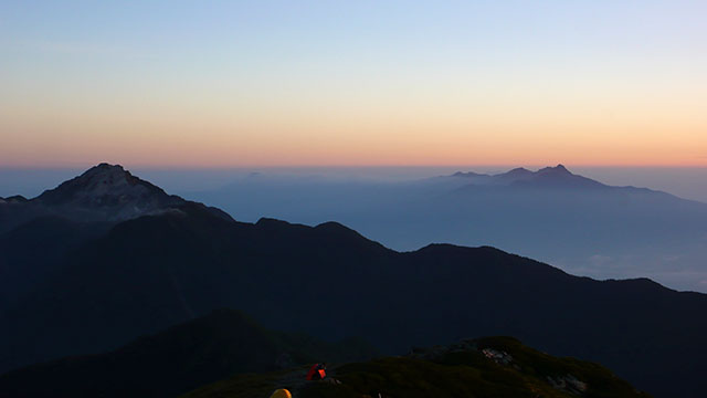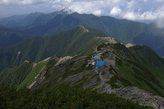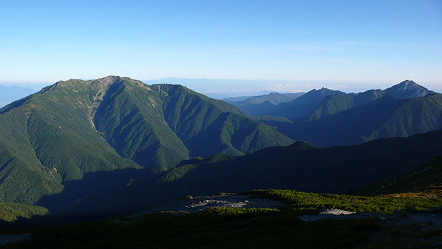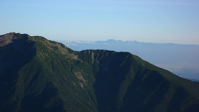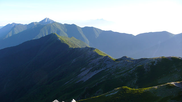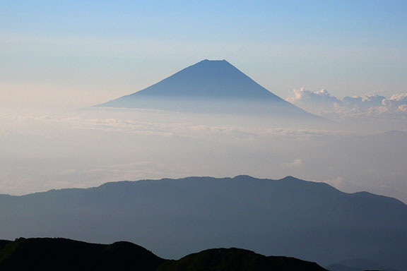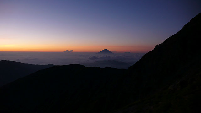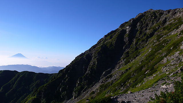 翌朝は打って変わったようにガスが晴れ、雲海の上に富士山や八ヶ岳、それに北アルプスの山々までもくっきりと見えていた.御来光と富士山を一緒に見ることができるのも南アルプスならではだろう.この景色を見ることができただけで今回の山行は大満足だ.