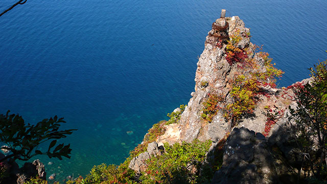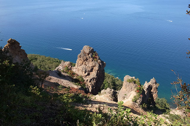 コバルトブルーの海を見下ろしながら崖の縁に沿って下りて行く