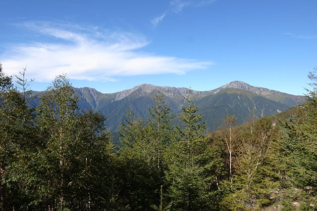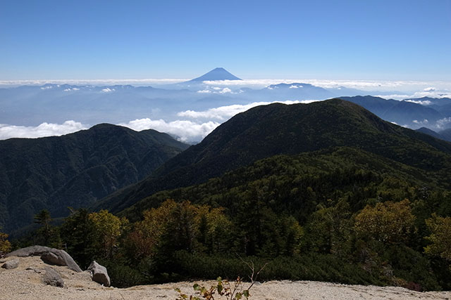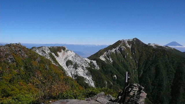 左前方には仙丈ヶ岳と甲斐駒ヶ岳の頭が見えている