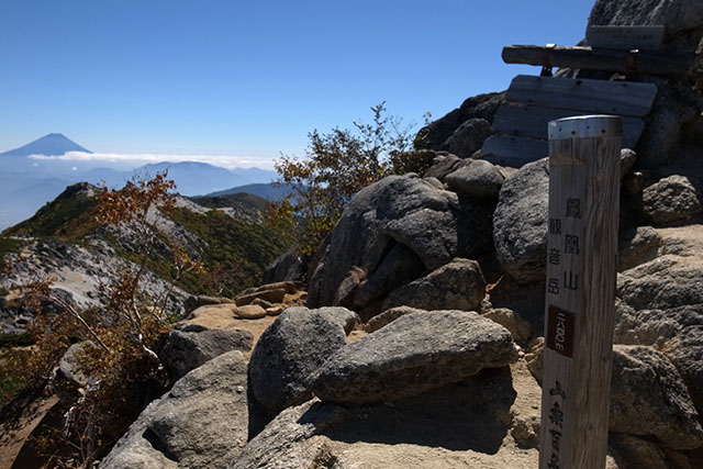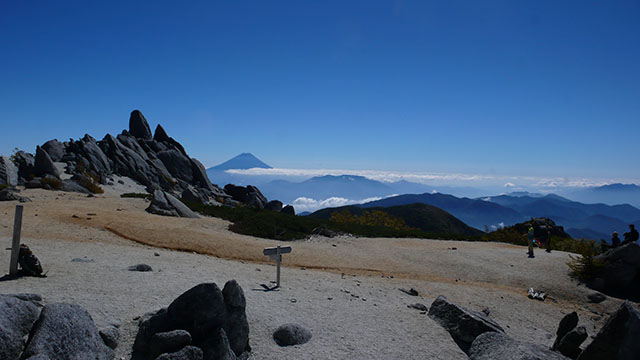 砂払いという場所に出ると360度視界が開け一気にテンションが上がる.前方には薬師岳とその奥に甲斐駒ヶ岳、右手には麓の甲府盆地や八ヶ岳連峰、右手後方には富士山、左側は北岳を始めとする白根三山を一望することができる.一旦下って薬師岳小屋から再び登り返して白い砂地の平坦な薬師岳の頂上に到着した.