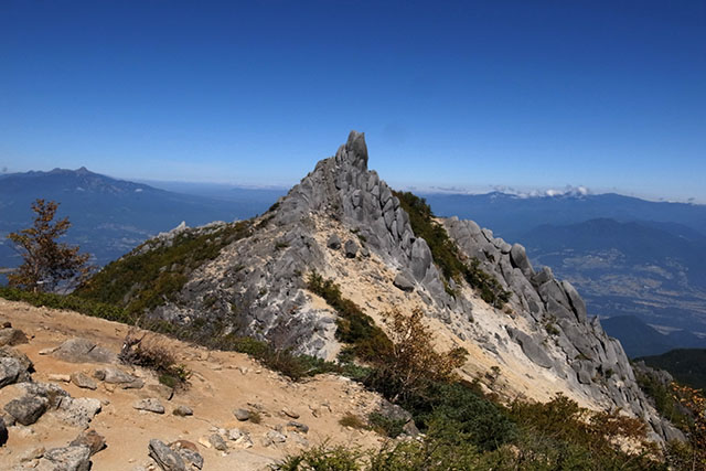 薬師岳を後にして三山の中で一番高い観音岳へ向かう.観音岳の頂上は大きな岩の上で三角点が置かれていた以外はそれと言った特徴はないが、360度の素晴らしい展望が得られる.地蔵ヶ岳は今回の縦走コースから少し離れているので今回は大きな岩のオベリスクがある地蔵ヶ岳へは立ち寄らなかったが、次回はオベリスクの岩の上に登ってみようと思う.
