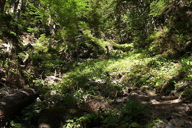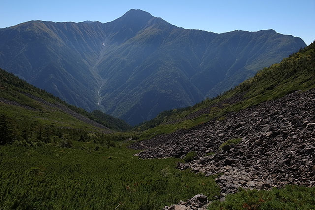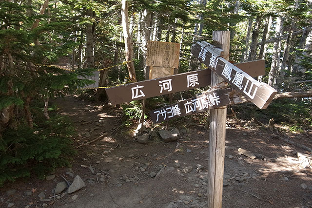 今日の目的地の広河原までは高嶺を越えて白鳳峠へ下りそこから広河原へ急な斜面を一気に下りていく.高嶺から白鳳峠までは急な岩場の斜面が続き、岩場の急斜面に慣れていないと降りるのは結構大変そうだ.白鳳峠からアサヨ峰方面は先日の台風で登山道が崩壊してしまったようで通行止めになっていた.白鳳峠から広河原までの下りは最初は比較的緩やかな岩だらけのゴーロ地帯が続くが、森林地帯に入ると一気に急斜面になって疲れた足腰には相当厳しい下りが続いた.この下りは足場が滑り易くバスの時間を気にしながら焦って下りるのはとても危険だ.地図で眺めているだけでは良く分からないが、このルートは上りも下りも相当厳しいことを覚悟しておいた方が良いだろう.