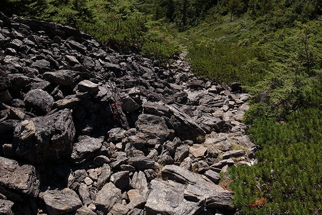 最初は緩やかな歩き易い道が続くが登山道の廻りは樹木で覆われ展望の殆ど無い単調な登りが続く.山と高原地図では夜叉神峠から苺平までのコースタイムは4時間となっているが実際に要した時間は2時間も掛からなかった.今回はテントやクッカー、食料などの重装備で歩くはめになってしまったが、日帰りハイクの軽装備であればもう少し時間を短縮できるだろう.南御室小屋で一休みして美味しいと評判の水を存分に味わう.南御室小屋はこの近辺では一番の大きな営業小屋で鳳凰三山を巡るにはこの小屋を利用すれば便利そうだ.南御室小屋から薬師岳まではザレて深く抉られた急な登山道が続くが、深く抉られた登山道を巻くような形で迂回路が設けられているので比較的楽に登ることができる.