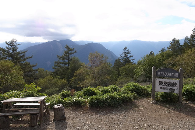 夜叉神峠は北岳、間ノ岳などの白根三山を一望する事ができる格好のビューポイントで、登山口から40分程度で登ることができるので土日は大勢のハイカーが訪れるようだ.この日は既に午後3時を廻っていたので時折山を下りてきた人達が通過するだけで小屋の廻りは閑散としていた.鳳凰三山を縦走する場合は南御室小屋か薬師岳小屋あたりで一泊するのが一般的だが、今回はほぼ日帰り縦走と言うことで夜叉神峠にテントを張り、翌朝夜叉神峠から歩き始めることにした.