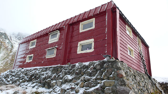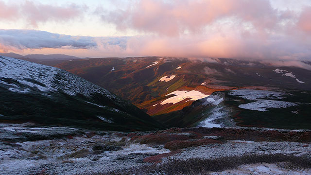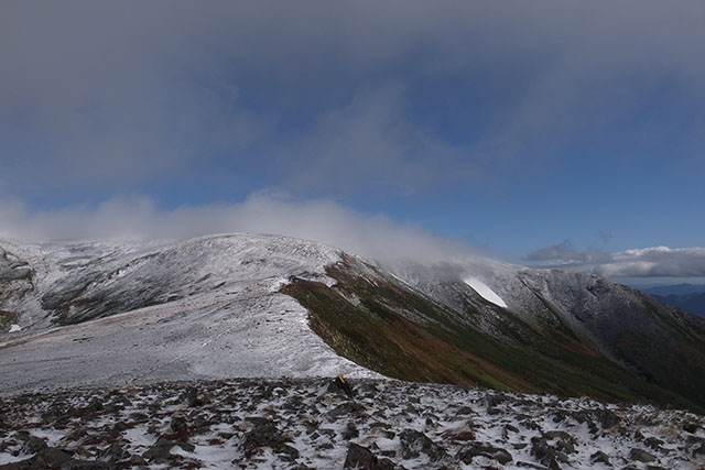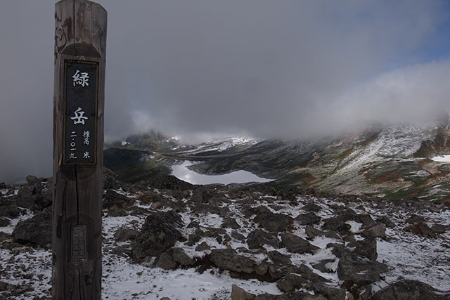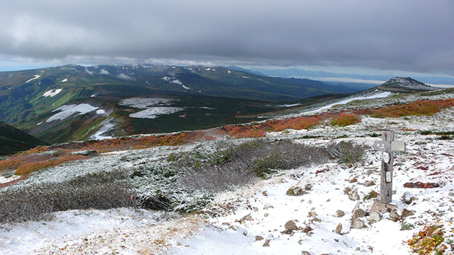 昨日の夕方から降り始めたみぞれ混じりの雪は夜には完全な雪に変わり、朝起きると積もった雪で辺り一面真っ白だった.大雪山系では例年紅葉の季節が始まる9月中旬くらいに初冠雪を迎えることが多いのでこの時期の雪は決して珍しくは無いが、数日前に猛暑の東京に居た身にとっては劇的な環境変化だ.積雪量は大したことなく歩くのが困難という程ではないが、吹きだまりに足を取られてしまうと膝下位まで雪に埋まってしまう.
