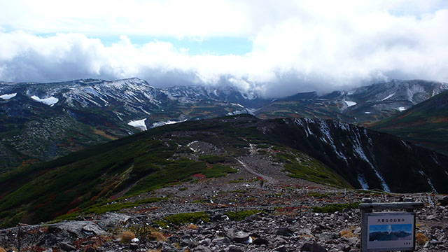 小泉岳から北海岳へ向かう途中で、白樺荘で一緒になった在住フランス人のC君と再開した.彼は17日に黒岳石室、18日に白雲岳避難小屋に泊まる予定で計画を立てていたが、初日の悪天候で一日順延して18日に黒岳石室に泊まり、この日の朝に北海岳を経由して銀泉台へ下山するところだった.