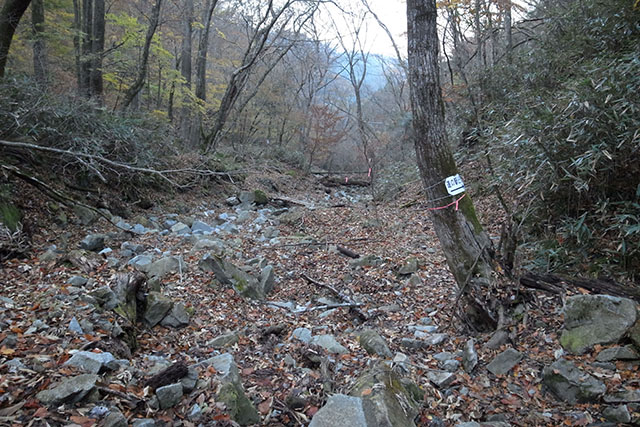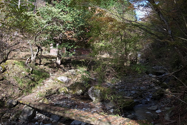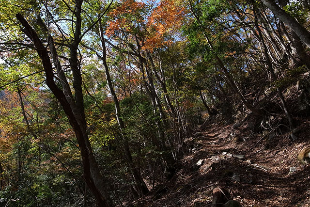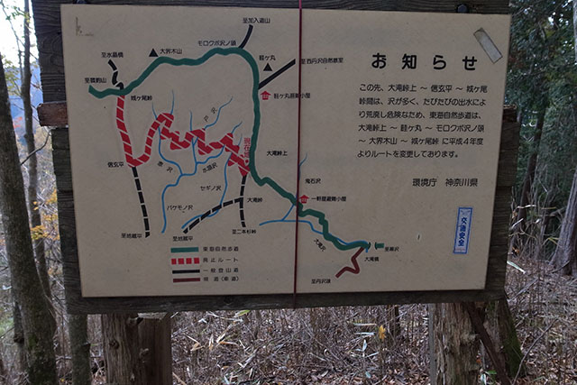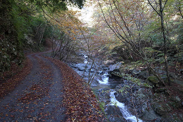 この日の新松田9:35発のバスは予定よりも大幅に遅れて大滝橋バス停に着いた.大滝橋を出発する頃には既に11時を過ぎていたので、この分では菰釣避難小屋に着くのは午後4時近くになってしまうだろう.水汲みの時間を考えると急がなければいけないが、履き慣れない堅い靴ではいつものように歩けないので、紅葉を楽しみながらのんびり登ることにした.