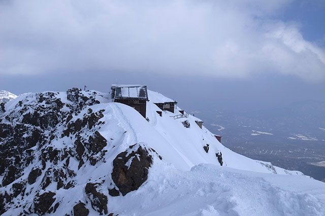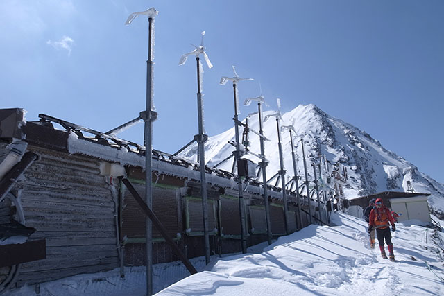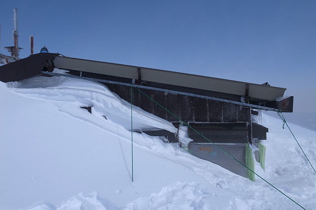 プロペラが吹き飛んでいる赤岳展望荘の風力発電機