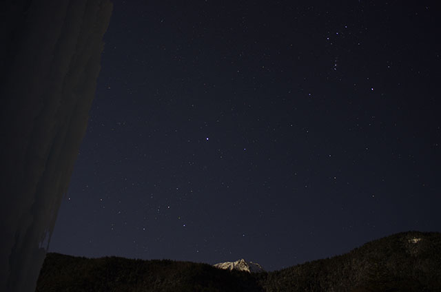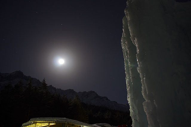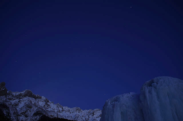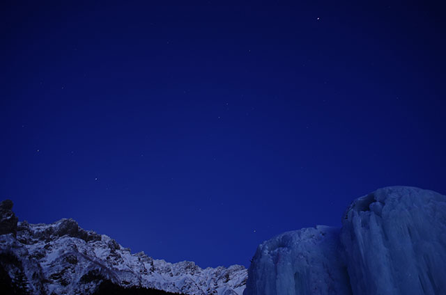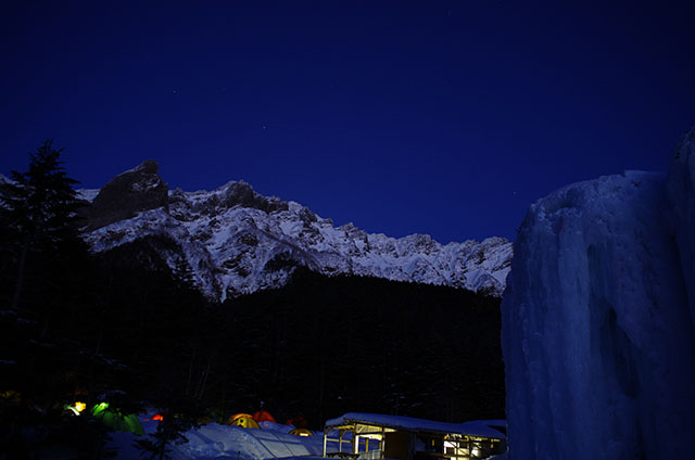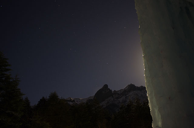 日が暮れる頃から人工の氷壁の周辺で撮影を始めるが、星空と周囲の山々を同時に移し込むような絶好の撮影場所が見つからない.テント場の灯りやほぼ満月の月明かりに邪魔されて満足な撮影ができなかったので、星の撮影はまた別な機会に譲るとして、今回はアストロトレーサのテストだけに絞って撮影することにした.