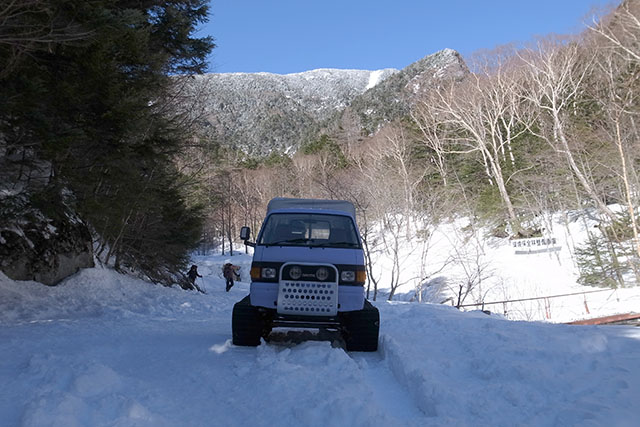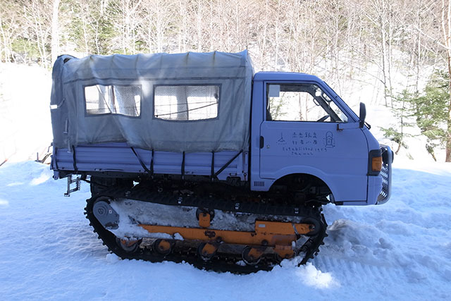 赤岳鉱泉と行者小屋の自家用車を改造した雪上車