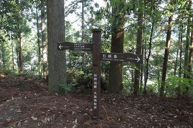 朝7時前、川湯温泉のキャンプ場を後にして本宮へ向かう.奥駆道の本来のコースは大斎原から熊野川を渡って(禊ぎを受ける)七越峰へ向かう尾根道に入るらしいが、流石に熊野川の本流を渡渉する訳も行かないので備崎橋から七越峰へ向かう.尾根道への取り付き場所が良く分からなかったので、とりあえず車道を歩く事にした.七越峰は西行の歌で名前だけは知っていたが、峰の頂上からの展望は殆ど無く西行の歌碑が建っているだけでちょっと期待外れだった.