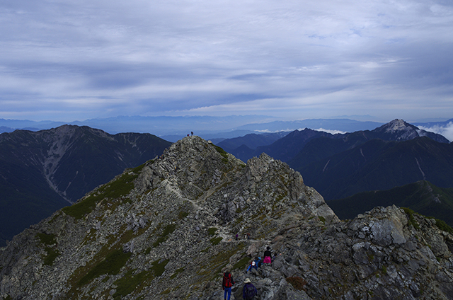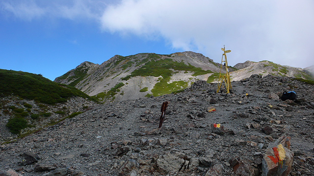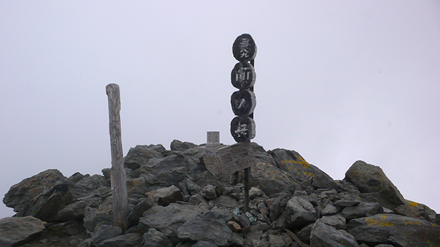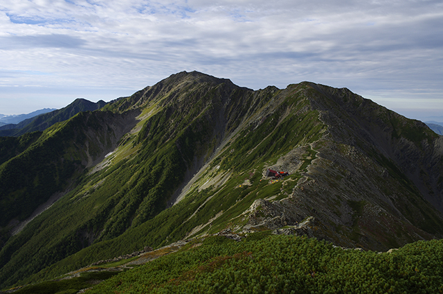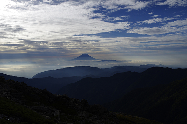 三日目の朝はまだ日が昇る前の暗いうちから皆テントの撤収を始めていた.私はのんびり日の出の富士山でも眺めながら朝食の準備にとり掛かったが、ガス欠でお湯を沸かすことも出来ず、結局朝食を食べることができなかった.完全な空腹状態で広河原まで下りるのは無謀なので、とりあえず肩の小屋で朝食補給してから下山することにした.いつもなら1時間も掛からずに登れそうな北岳だったが、完全にシャリバテ状態なので2時間以上掛けて牛歩戦術で北岳を目指した.何とか北岳の頂上に辿り着いたものの、今の最大の関心事は朝食に有りつく事なので、休憩もせずにそのまま肩の小屋へ向かった.