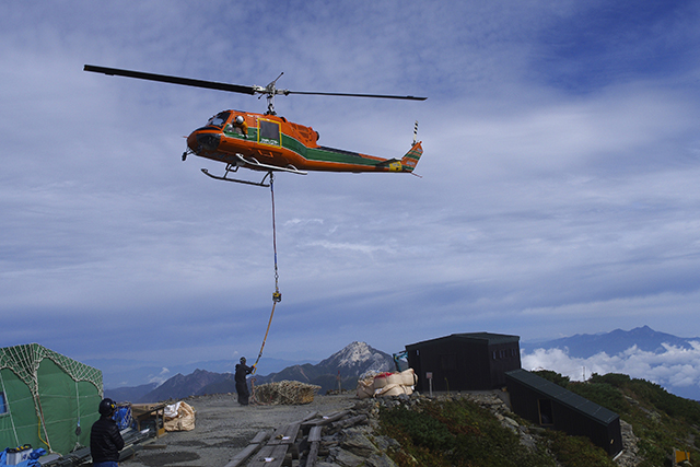 肩の小屋でうどんを食べながらのんびり休憩していたら、肩の小屋でもヘリの荷揚げ作業が始まった.休憩も兼ねてしばらくヘリの荷揚げ作業を間近で見物していた.ヘリは広河原と小屋の間を何往復もして荷揚げを行っていた.歩いて登ると3〜4時間もかかる所をヘリは1分も掛からずに登って来る.ヘリ荷揚げによる大量の物資に支えられた山小屋運営により多くの登山客を収容できる様になったが、どう見ても山のキャパシティーを大幅に超えてしまっている.