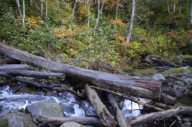 25日のバスで層雲峡温泉から十勝三股へ向かうが、この日は天気予報の予想通り午後から台風16号くずれの低気圧の影響を受けて雨が降り出した.幸いなことに十勝三股のバス停には立派なバス待合小屋があったので、ここでレインウェアに着替えてから登山口へ向かった.十勝三股から一六の沢コース登山口まではかなり状態の良い砂利道の林道で、とても緩やかな登りの道が続いた.国道から登山口までは約8Kmで雨の中を2時間掛けてトコトコ歩いて行った.雨と汗でビショビショになりながら登山口に辿り着いたが、車が1台駐まっていただけで辺りは閑散としていた.雨で無ければ天狗のコルにあるテント場まで行くつもりだったが、雨の中そこまで行く気力がないので登山口の空き地にテントを張らせてもらうことにした.本当はこの場所でテントを張っては行けない様だが、今回は大目に見て貰う事にする.日が暮れてから軽自動車三台でやってきた7〜8人の若者のグループもテントを張っていたので、彼らも私と同じように翌朝から登り始めるのだろう.熊さんの居住地の真っ只中に独りではとても心許なかったが、これだけの人数が居れば熊もおいそれとは近づいて来ないだろう.テントに当たる雨音と沢の音を聞きながら早めに就寝する.