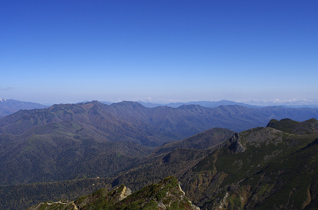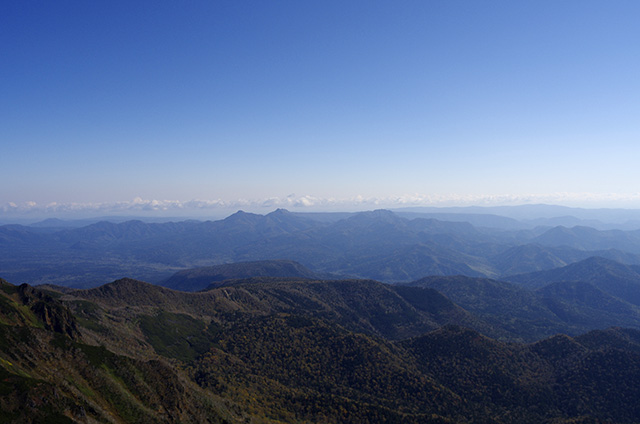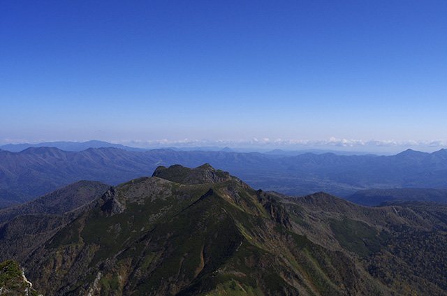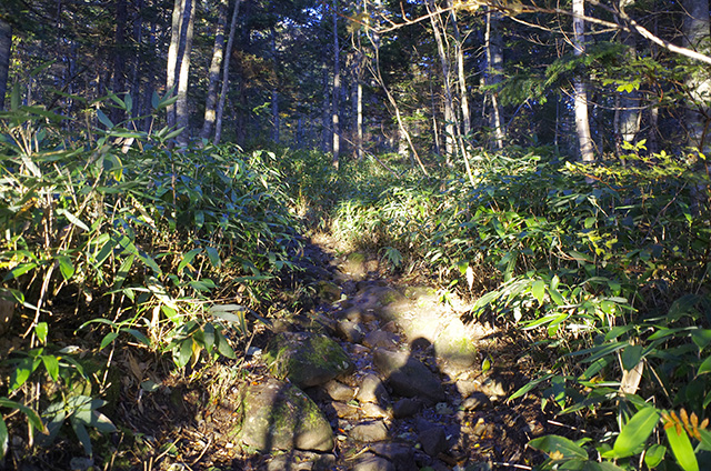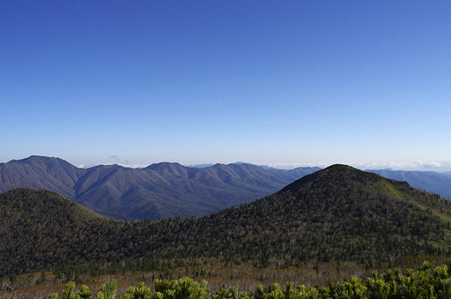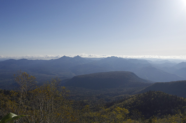 沢に架かる倒木の丸太を越えて登山を開始する.途中でGPSのログを取るのを忘れていたことに気付くが、登山口まで引き返してから再び登り返す気力はない.テントは登山口に置いてきたので今日はとても身軽だが、何となく足が重く調子が出ない.暫くは見通しの効かない樹林帯が続いたが、登山道は朝日を浴びてとても心地が良かった.小天狗の手前で麓の視界が開け、西クマネシリ岳(通称おっぱい山)などの東大雪の特徴的な山々が眺望できる様になった.