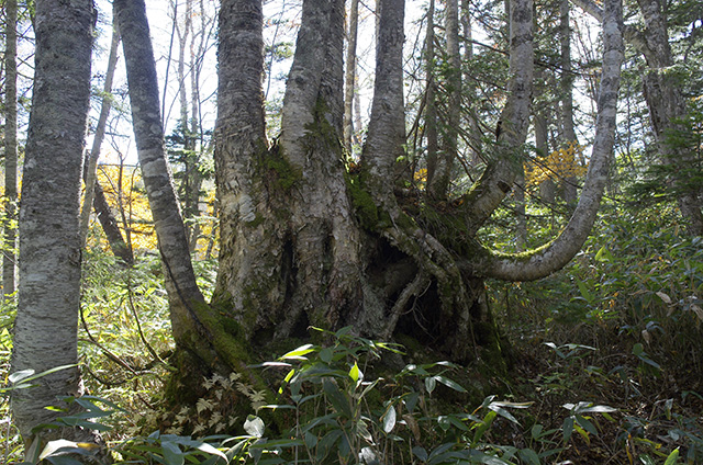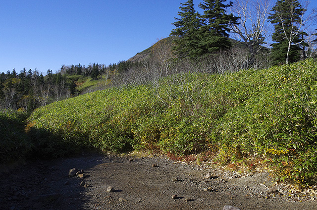 時間が許す限りニペソツ山の眺望を独り占めしていたかったが、帰りのバスの時間も気になるので早めに下山する事にした.前天狗の登り返しがちょっときついが、帰りは周りの景色や草木を観察しながらのんびり下りる事ができた.下山中に昨夜からの若者グループも含めた20人ぐらいとすれ違っただろうか.登山口に戻ってきたときには車が10台くらいに増えていたので、今日はかなりの人達が入山しているようだ.