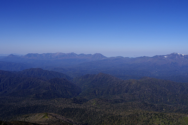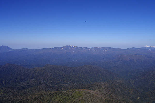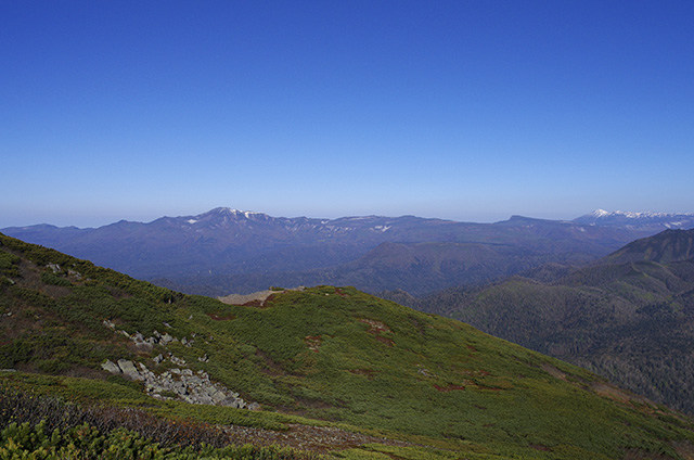 右手前方にはトムラウシ山や旭岳などの雪を頂いた大雪の山々