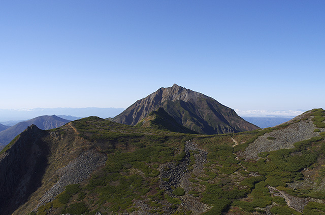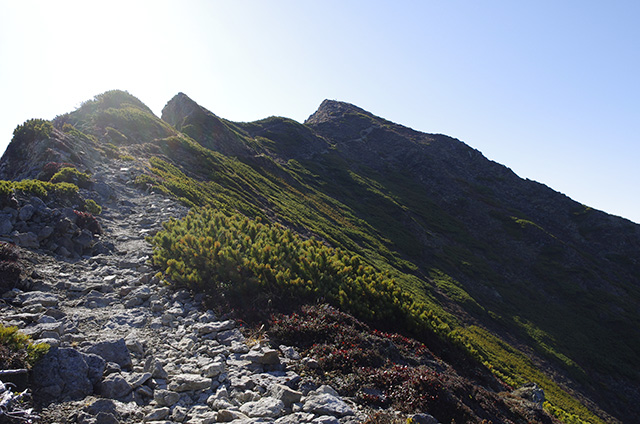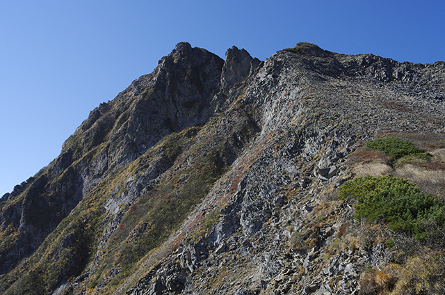 小天狗の岩場を抜けると天狗のコルと呼ばれる場所に出た.目の前には前天狗岳が聳えているが、ニペソツ山はまだ見ることができない.途中テントを張ることが可能な場所があったが、2〜3張り位しかテントを張ることができないような非常に狭いスペースだった.雪解けシーズンであればこの辺りで雪解け水を確保できそうだが、今のシーズンでは水は登山口で補給するしかないようだ.