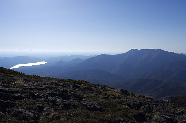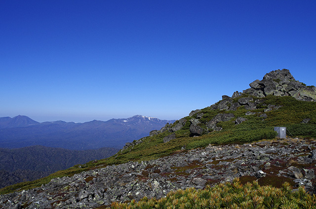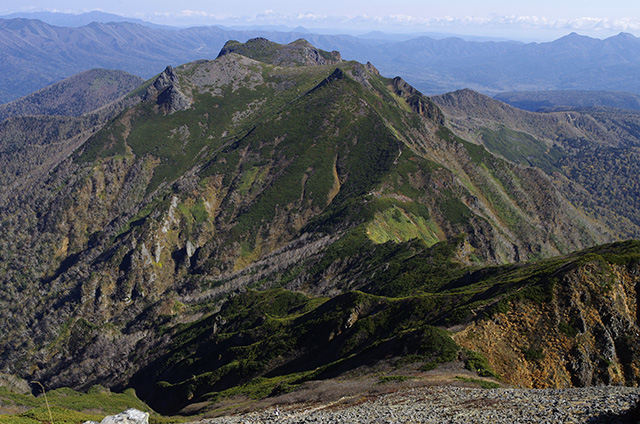 振り返ると台形の軍艦山と彼方に西クマネシリ岳が見えている