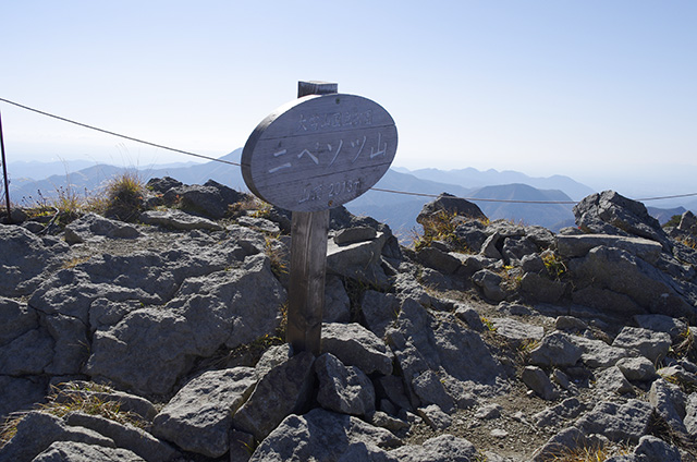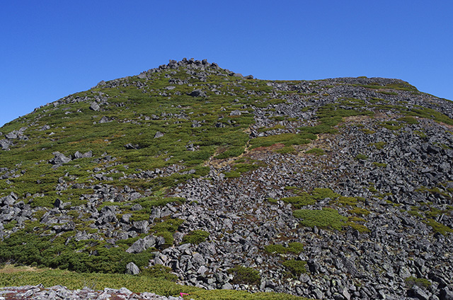 前天狗岳から一旦下ってニペソツ山頂へ向けて再び登り返す.目の前に聳えるニペソツの荒々しい東壁斜面を見るととても登れるような斜面には見えないが、頂上へは手前から西側斜面を巻きながら登って行くようだ.西側斜面の巻き道は思っていたよりも緩やかで、安全な道だったのでちょっと安心する.予定よりも少し遅くなったが待望のニペソツ山の頂上に立つことができた.頂上からの眺めは素晴らしく、ほぼ360度視界が開けている.天気も良く大雪山系の山々や十勝連峰、昨年登ったウペペサンケ山や糠平湖などを見通す事ができる.
