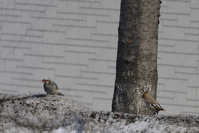 帰り際に、旧国道5号線まで降りていく途中で歩道の上の水たまりの水を飲んでいる鳥を見かけたので近づいてみたら、何とキレンジャクだった.都会の交通量の多い道路の上でキレンジャクを見るというのも何となく不思議な感じだ.札幌は都会にしては珍しいくらい自然環境が残されているので、野鳥観察をするのは絶好の場所かもしれない.