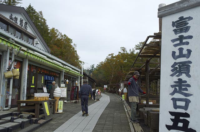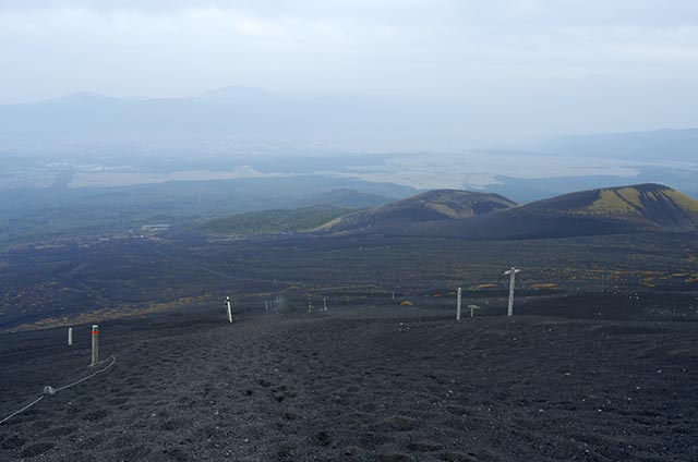 まだ観光客は少ない時間帯だ 5合目付近は大部色づき始めている どんよりとした冴えない天気 唯一営業中の大陽館 八ヶ岳が遠くに 気温-5度の頂上 こんな天気では... 剣ヶ峰に立ち寄る気も失せてしまった モノトーンの宝永山 砂走り館でちょっと休憩 いざ砂走りへ 二号八尺のランドマークがない!!!
