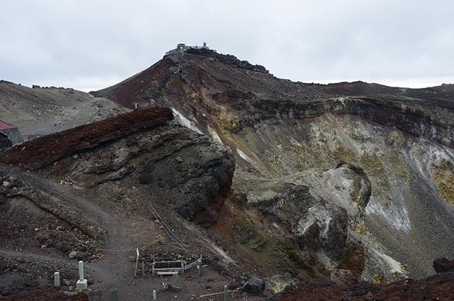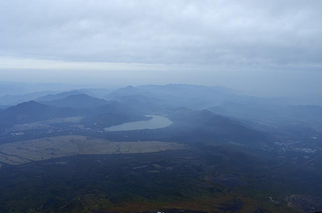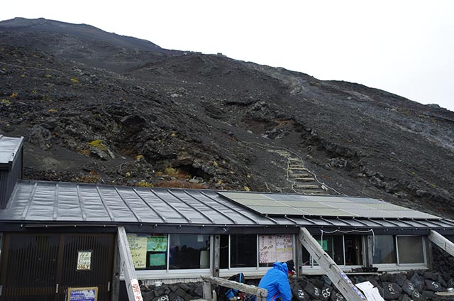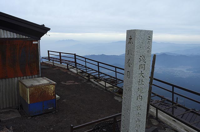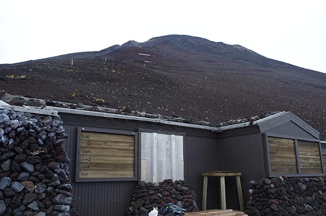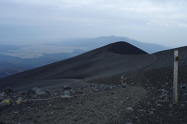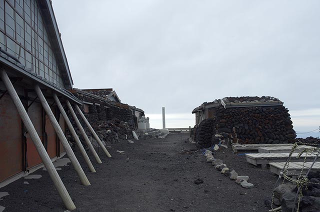 天気予報を見る限りスカットした快晴は望めないだろうと思っていたが、予想以上にどんよりとした雲行きで写真撮影には全く向いていなかった.麓では微風だったが山頂付近では10〜20m/sくらいの風が吹き荒れていた.この日のお昼頃の山頂の気温は-5度と予想よりもかなり低く、のんびりと頂上の散策などしていられる状況ではなかった.スポーツドリンクの水分が凍ってシャーベット状になる程だった.明日は雨と言うことなので、明後日の朝には真っ白な雪化粧を施した美しい富士山を見る事ができるだろう.