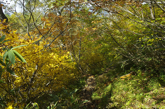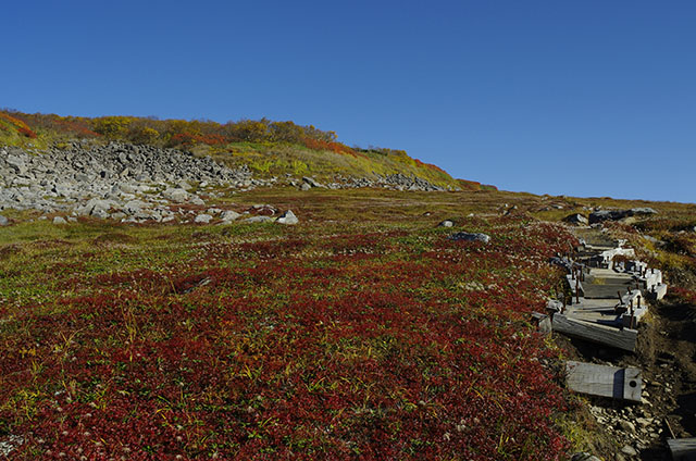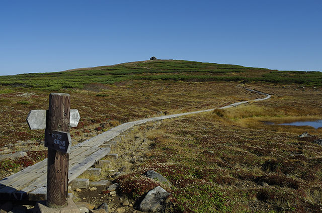 昨日のガスまみれの天候とは打って変わって、空は雲一つ無い絶好のコンディションだった.今回の縦走の最終日が最高のコンディションとなったことに感謝しながら化雲岳へ向かう.ヒサゴ沼から化雲岳へかけての緩やかな斜面は『神遊びの庭』と呼ばれている場所で、夏の花のシーズンはさぞかし美しい光景が続くのだろう.次回は夏の花のシーズンに此処を訪れることにしよう