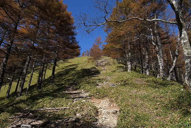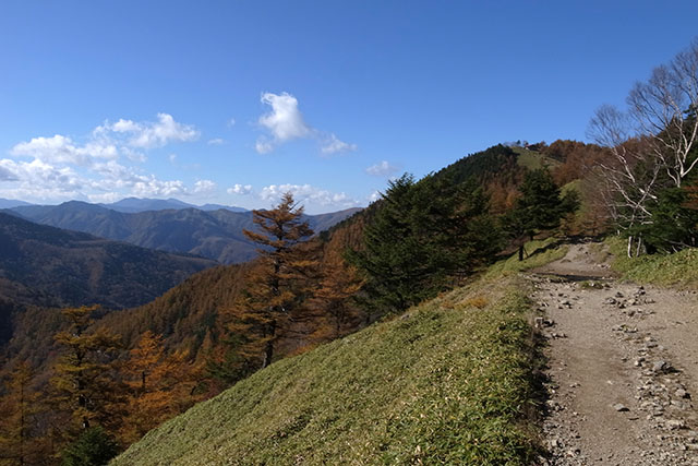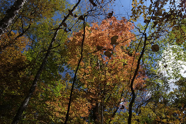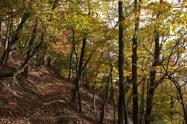 最初は杉の植林地帯の薄暗いジメジメしたコースが続き鬱陶しいが、植林地帯を抜けると丁度紅葉が始まった明るい広葉樹林帯の林間コースとなり、木々の色づきや野鳥の声などを聞きながら楽しく散策できる.今回奥多摩に足を踏み入れて驚いた事は、周囲の山々が杉・檜の人工林で完全に覆い尽くされていて、何とも言えず不気味で重苦しい光景が広がっていたことだ.人工林自体は人手が掛けられていてきちんと管理されてはいるが、人工林の山は生物相の貧弱な「死んだ山」でしかない.山の奥深く入り込まなければまともな自然環境が残っていないというのはあまりにも悲しい.