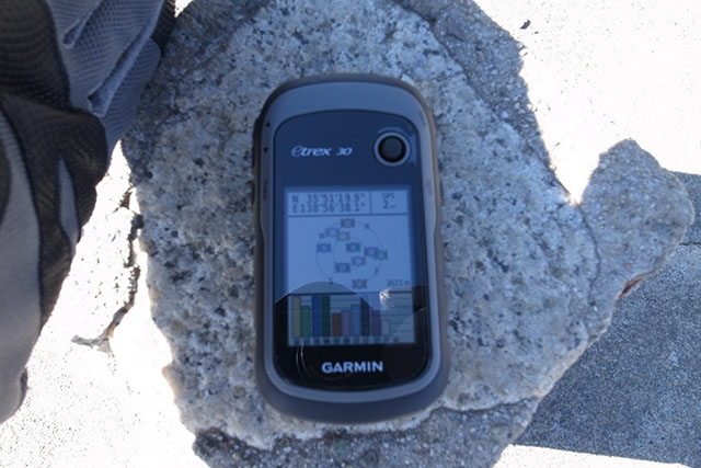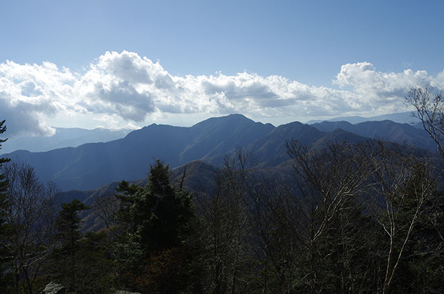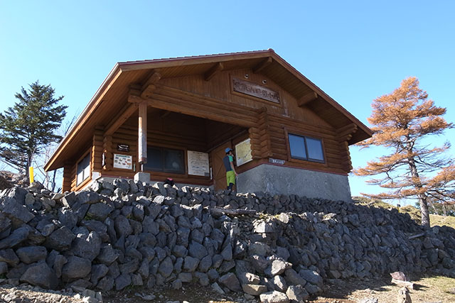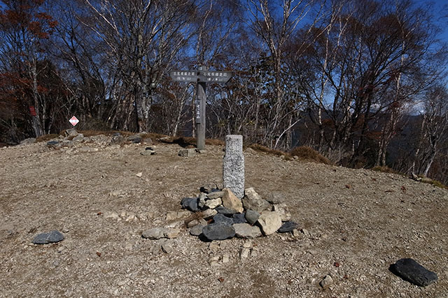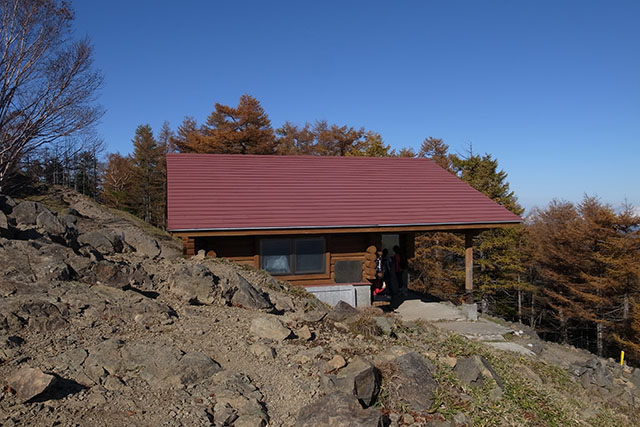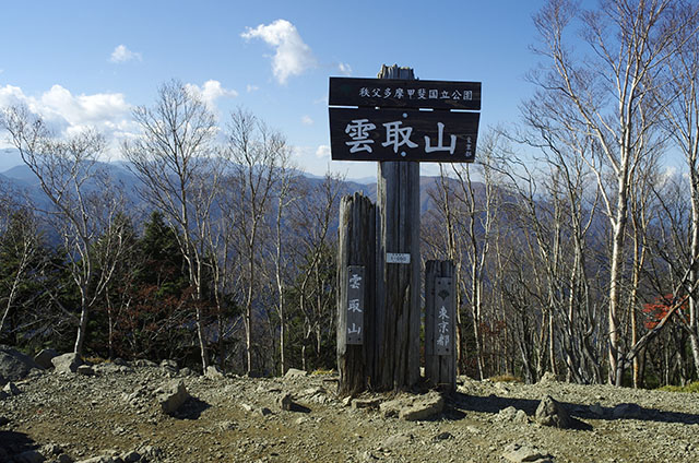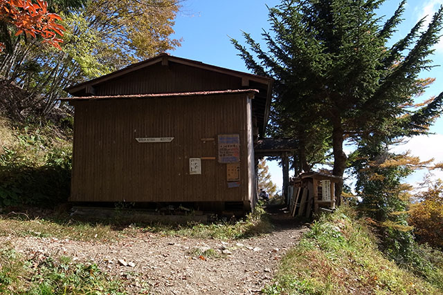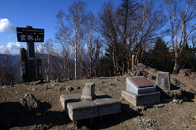 雲取山の頂上の手前にはログハウス風の赤い屋根の立派な避難小屋が建っていた.中はとても広く快適な避難小屋だ.山頂には一等三角点と明治初期に三角測量が始まった頃に設置された三角点の記念碑『原三角測點』が設置されていた.た頂上付近の木々が邪魔をしているので見渡す限りの展望という訳では無いが、これから冬場に掛けてはかなり遠くの山々まで見渡せそうだ.