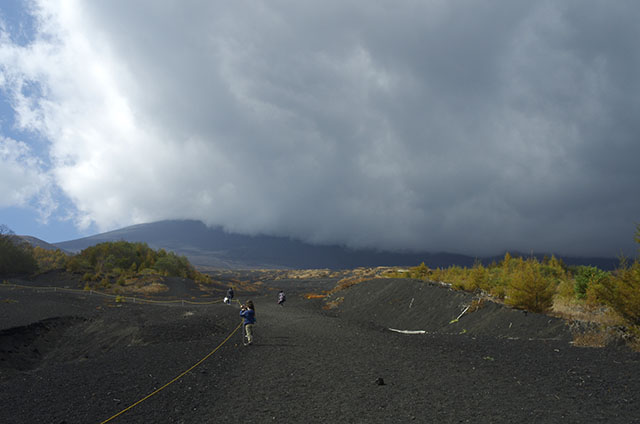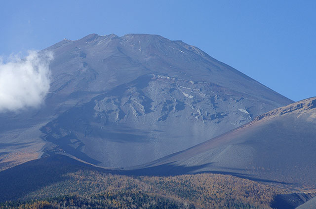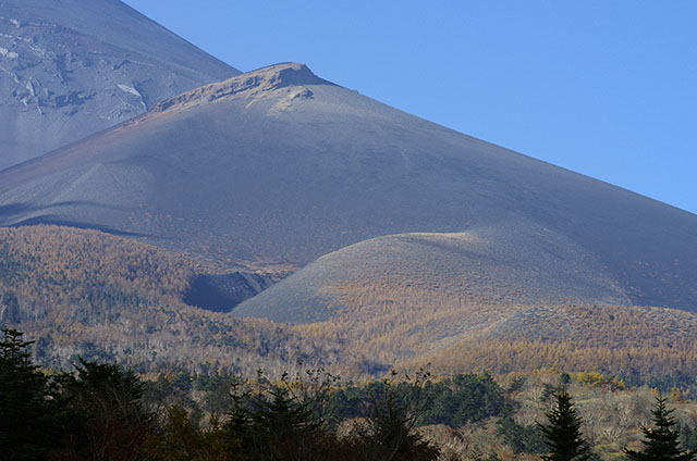 荒涼とした不毛地帯が続く御殿場コースとは対称的に御殿場口の西側一体はカラマツ林や広葉樹林帯が生い茂るとても楽しい樹林帯が続いている.富士山の周辺は下界よりも一足早く紅葉を迎えているようなので、膜岩ハイキングコースをお散歩してきた.