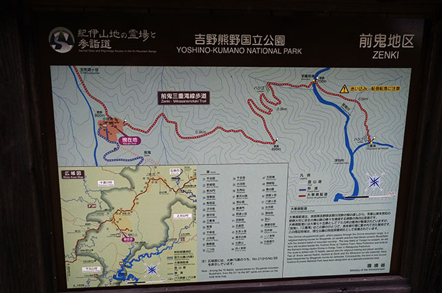 小仲坊のテント場の端に三重の滝への詳細なルート図が描かれた立派な案内板が設置されていた.この案内板が前回もあったかどうかは覚えて居ないが、主要ポイントまでの距離と標高が記されているのでとても親切だ.