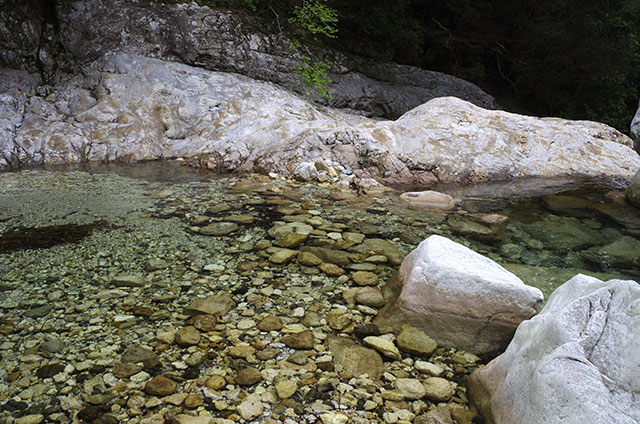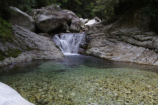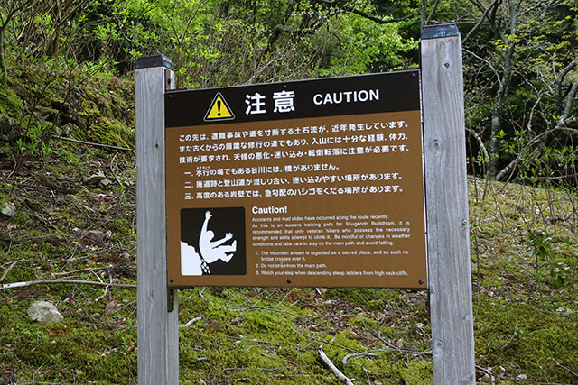 垢離取り場で靴を脱ぎ膝下まで水に浸かりながら渡渉し三重の滝へ向かう.前回ルートを外した地点を確認しながら慎重に進んで行く.問題のポイントに着くと、意外なほど明確なマーキングがされていた.何で前回ルートを外したのか不思議なくらいだ.沢沿いに進むという思い込みが失敗させたのだろう.