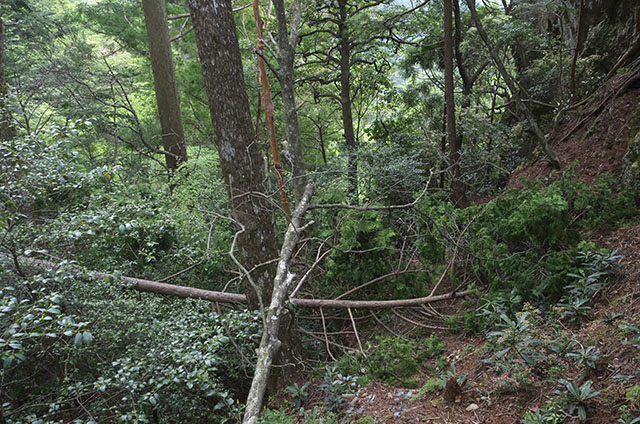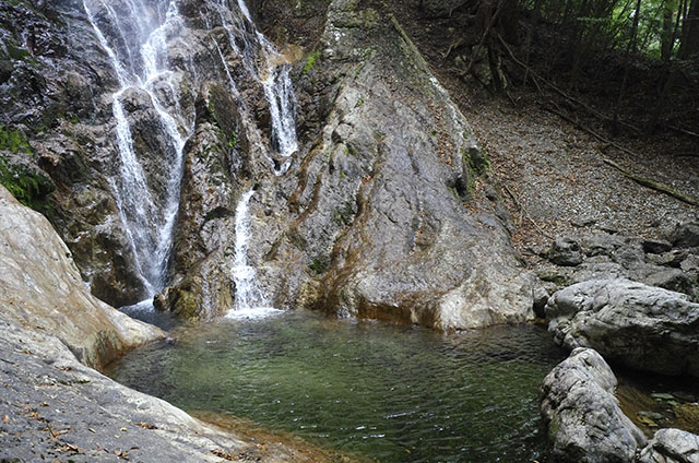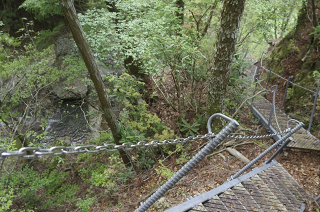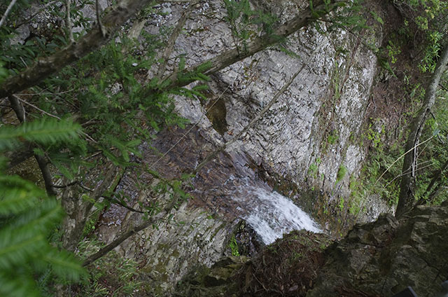 今回はきちんとマーキングに沿って慎重に斜面を登って行く.垢離取り場から三重の滝までは距離にして500m程と言うことだが、実際はアップダウンがあるので結構大変だ.最後の尾根を超えるとようやく滝の姿が樹木の間から見えてきた.ここから滝壺までは鉄製の長い階段を下って行く.階段を下りきると二段目の千手の滝の滝壺に出る.
