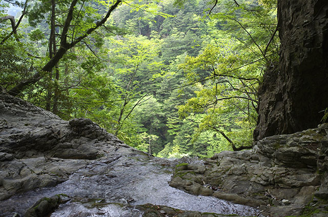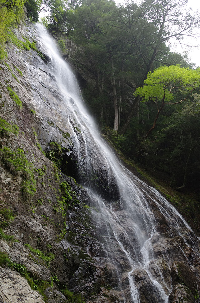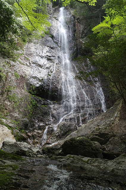三重の滝は上段が馬頭の滝(落差60m)、中段が千手の滝(落差50m)、下段が不動の滝(落差45m)となっているが、一般の人が見ることができるのはこの千手の滝だけのようだ.千手の滝の右側の崖を登ると滝見台と呼ばれる場所があるらしいが、渡渉するのが厄介なので今回は諦めてこのまま引き返すことにする.