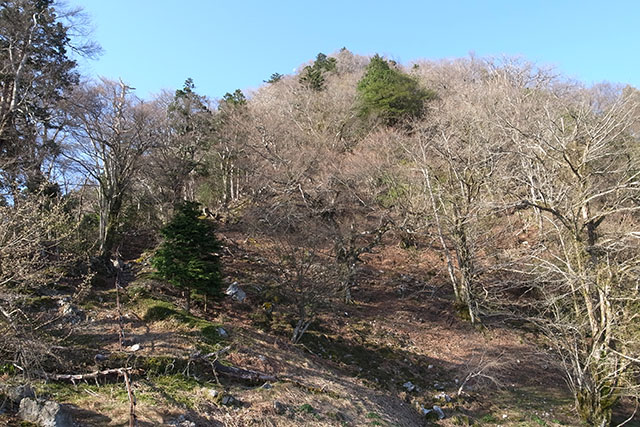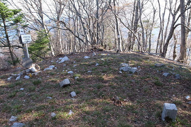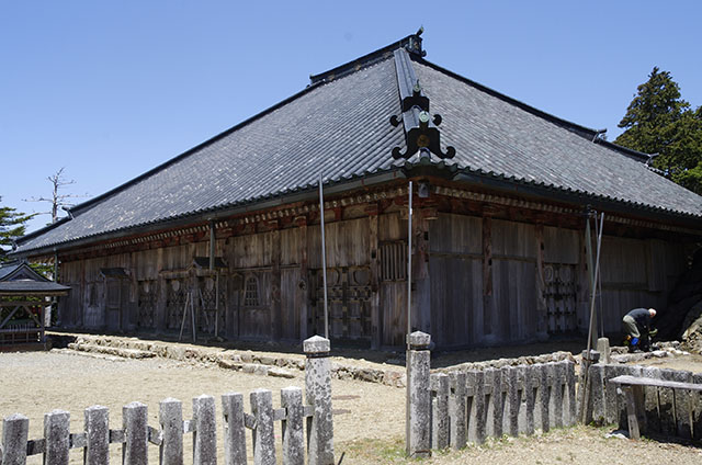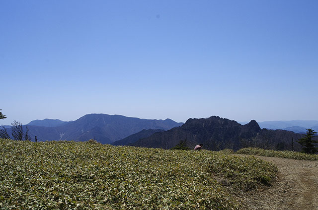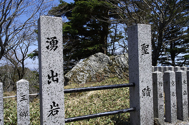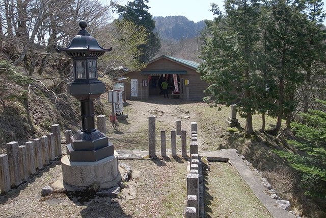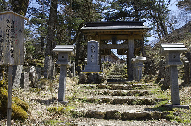 等覚門を潜り抜けるとその先に五軒の宿坊が建ち並んでいる.5月3日の開山前なのでまだ宿坊は営業していなかったが、どの宿坊も営業前の準備で忙しそうだった.大峯山寺の本堂もまだ閉まったままだった.本堂の正面には平坦な小笹の繁る丘があり、展望も良く長居をしたくなるような快適な場所だった.山上ヶ岳の頂上にあたる湧出岩と呼ばれる場所の手前には一等三角点が設置されており、山上ヶ岳は一等三角点百名山にも選定されている.