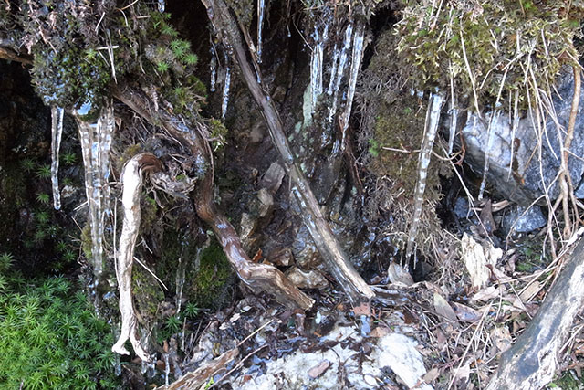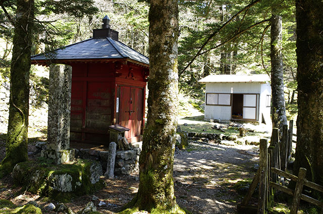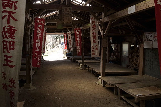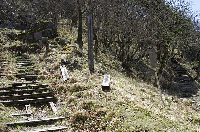 同辻茶屋で洞川温泉方面からの登山道と合流すると一気に人が増えた.同辻茶屋は休憩所として現在も登山客やお参りの人達に飲み物やお土産物を提供しているようだが、まだ開山前なので営業はしていなかった.同辻茶屋の先に陀羅尼助茶屋があり、そこから道は二手に分かれるが今回は左手の鐘掛岩経由のルートを選んだ.
