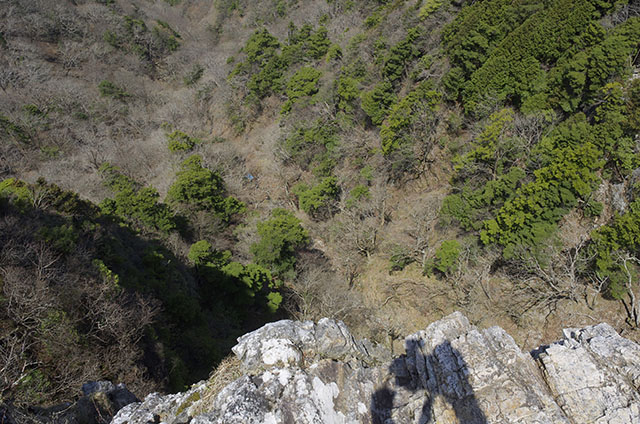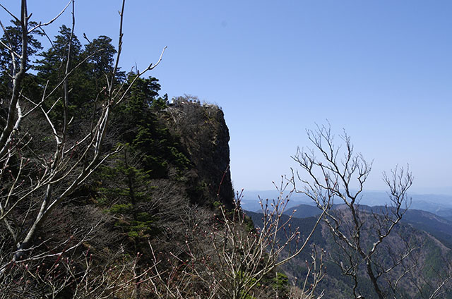 鐘掛岩と呼ばれている行場からは洞川や吉野方面を一望することができる.おじさんが鐘掛岩をよじ登りホラ貝を吹いていた.鐘掛岩の先には西ノ覗と呼ばれている崖の上の行場がある.上半身にロープを括り付け半身を崖から突きだして懺悔を行う修行で、良くテレビで紹介されるので一般の人にとっては山岳修験道のイメージはこの光景だろう.