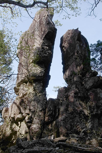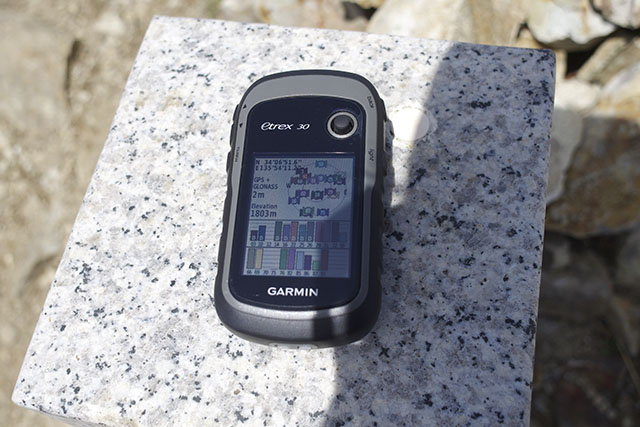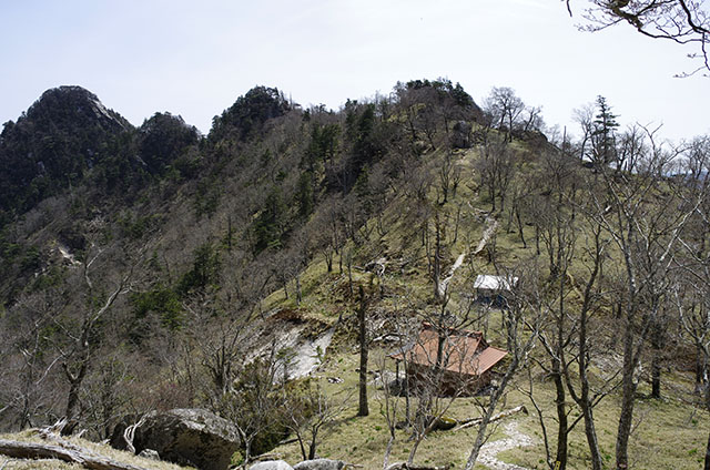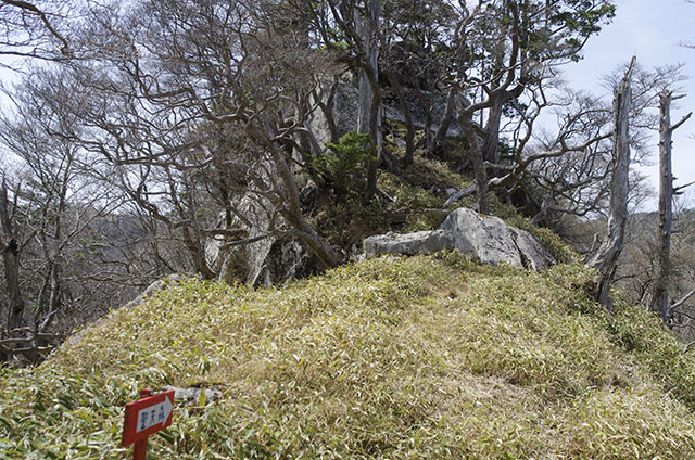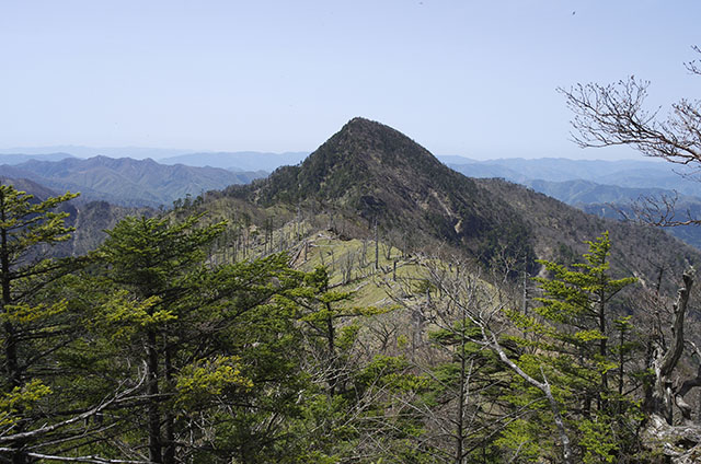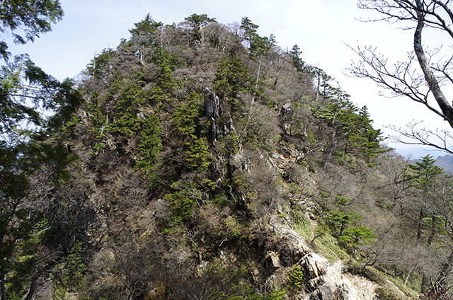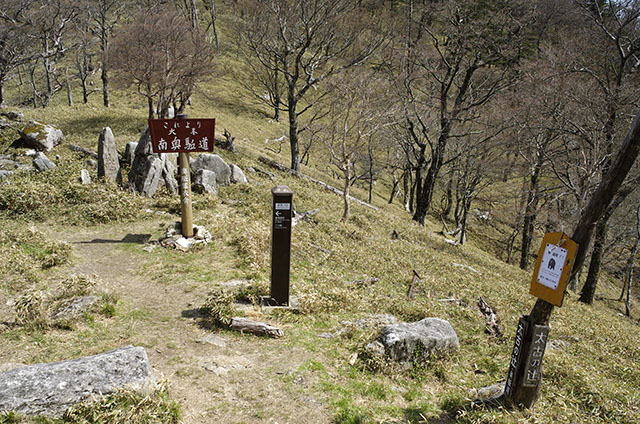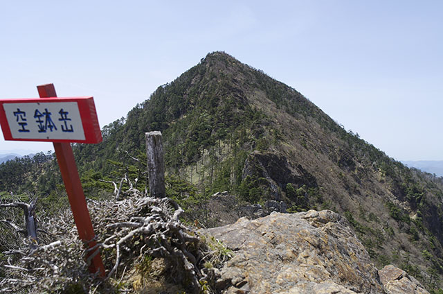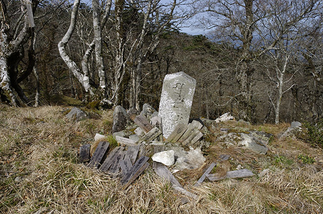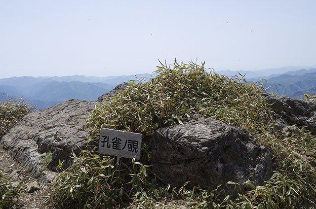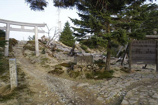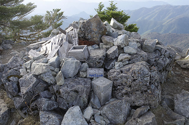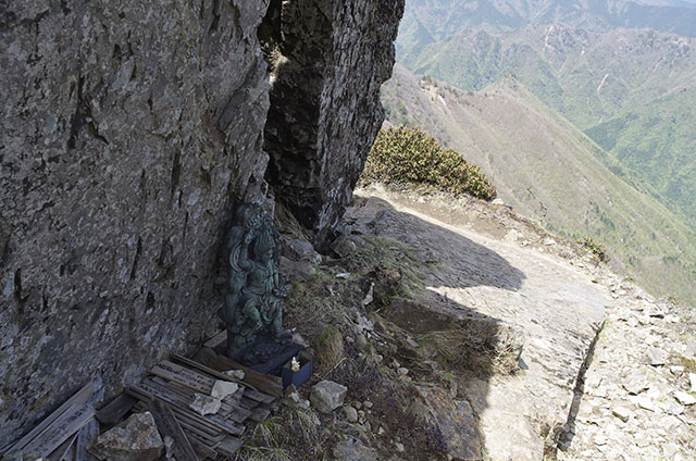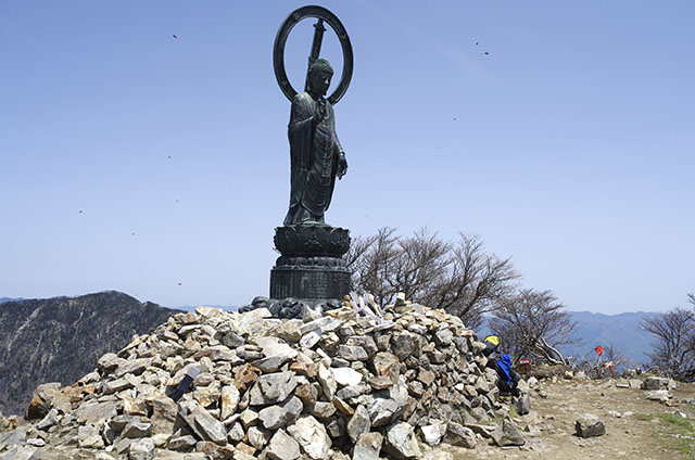 釈迦ヶ岳の上りも結構大変だが、ここを過ぎれば後は大部分が下りとなる.頂上に安置されているという釈迦如来像は遠くからも確認できる.釈迦ヶ岳の頂上は何故か蜂だらけで、写真に黒い点として写り込んでしまうのが困りものだ.お約束の一等三角点チェックを済ませてから、西行さんと関わりの深い深仙ノ宿へ向かって山を下りて行く.