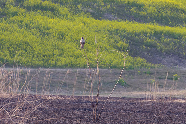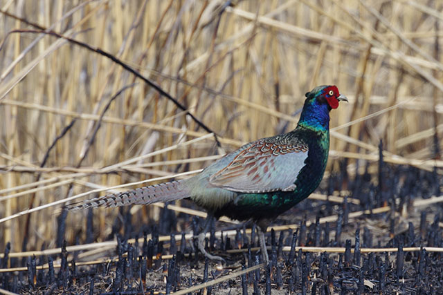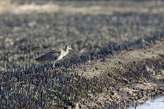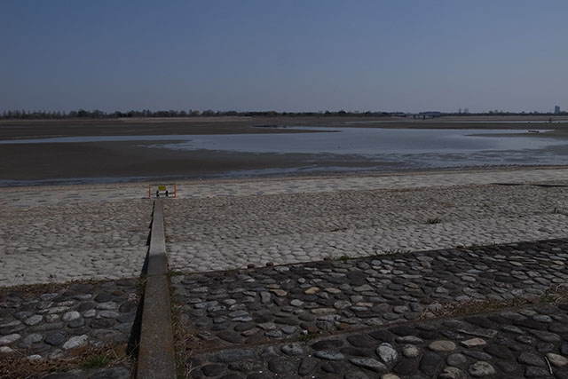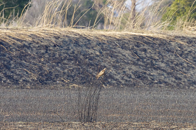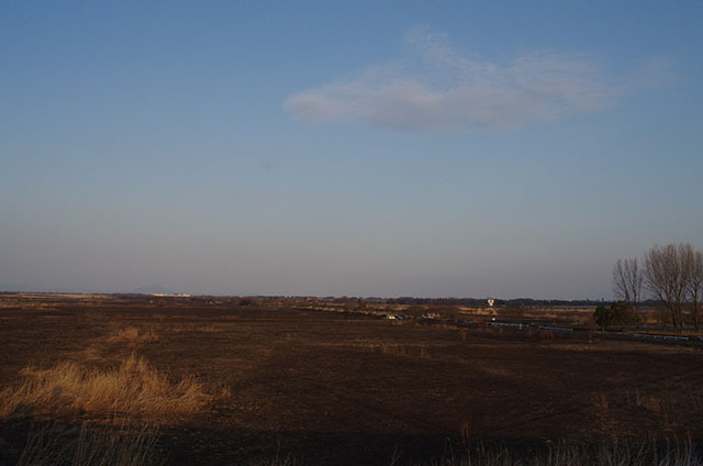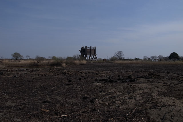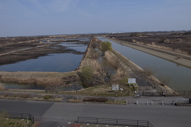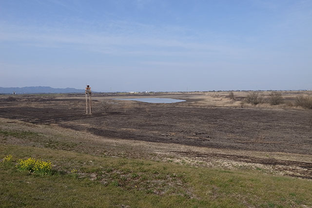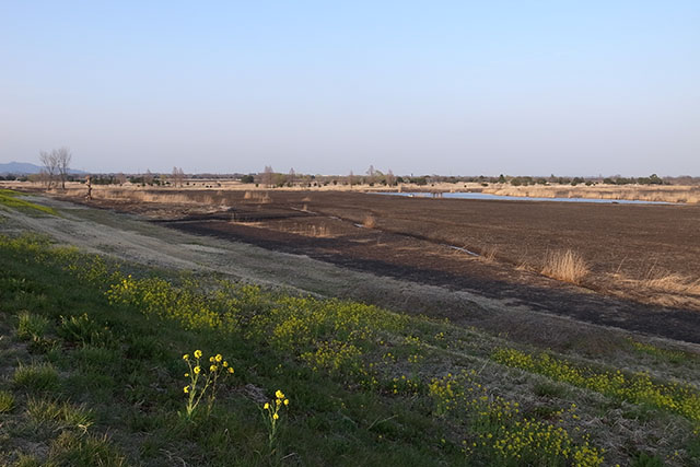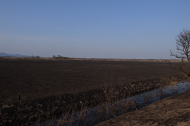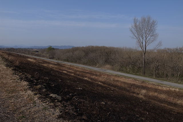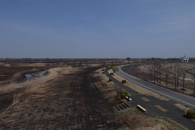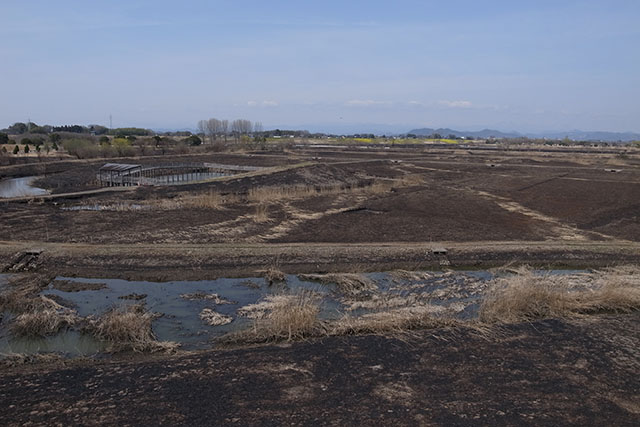 1週間前の3/18(土)に行われた『渡良瀬遊水地ヨシ焼き』の影響で、ヨシ野原は完全に焼き尽くされていて黒く焼け焦げた原野になっていた.遊水池のメインの水瓶である谷中湖は、『干し上げ』と呼ばれる水抜き中で干涸らびた巨大な水溜まり状態だった.