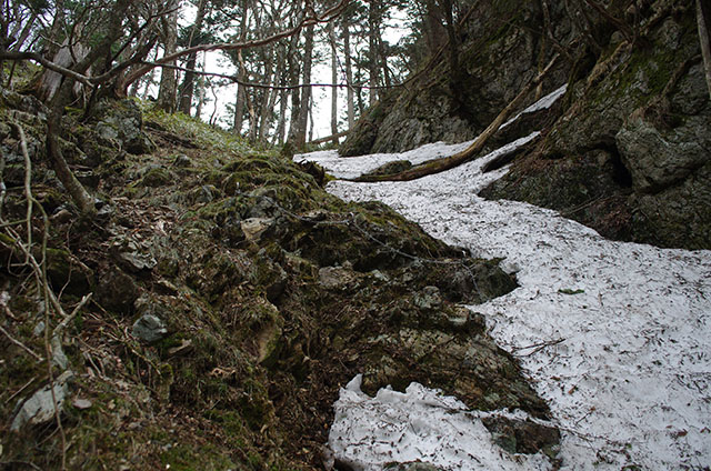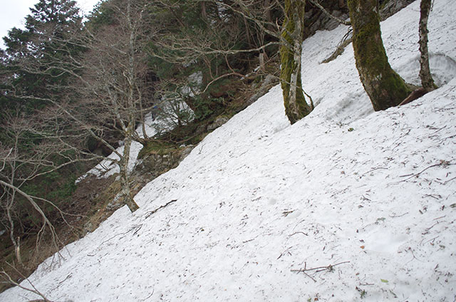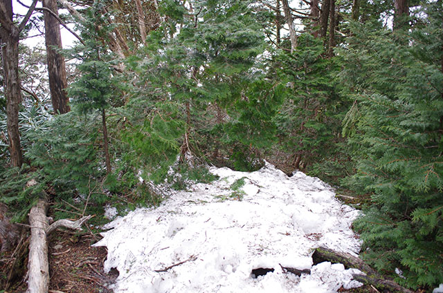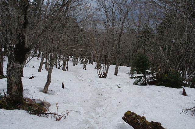 日本岳へのコルまで来るとコース上に大部雪が残っている