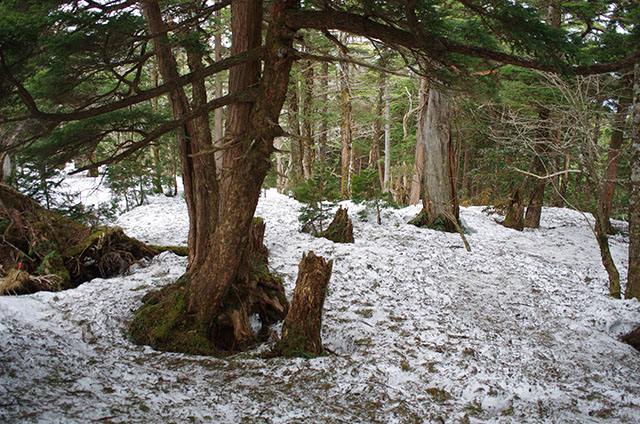 昨年は笙ノ窟まで登っているので、今日はその先の大普賢岳の頂上を目指すのが目的だ.昨年の奥駈けでは大普賢岳の巻き道を通るという痛恨のミスをしたので、今回は大普賢岳へのリベンジだ.途中で大普賢岳から下りてきた数組の人達とすれ違うが、皆アイゼンを装着していた.どうやら上の方はかなり雪が残っているようだ.