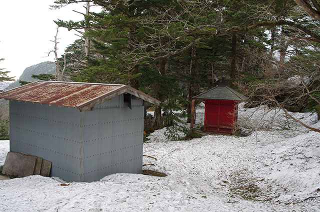 雪に悪銭苦闘の末ようやく今夜の宿泊予定地である小笹ノ宿に辿り着いた.小屋に入った途端に雷鳴が響き渡り、激しい雹混じりの雨が降ってきた.どうやら大気は非常に不安定なようだ.