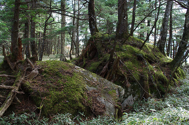 苔に覆われた石の上の樹木がなかなか良い感じ