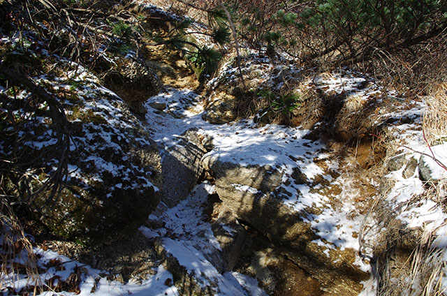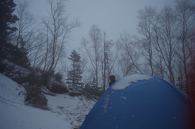 午後に入ると甲斐駒ヶ岳の上部はガスに包まれてしまい、山容を伺い知ることが全く出来ない状態になってしまった.日帰り組で頂上から下りて来た人達から様子を聞くと、上部では雪もちらついているということだったので、テントを張った後での頂上アタックは諦めることにした.七丈小屋の二段に分かれた狭いテント場の下段は、6~7組のテントを張ると少し窮屈な感じがする.テントを張り始めた頃にはかなり強いあられ混じりの雪になっていた.