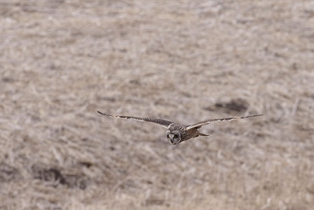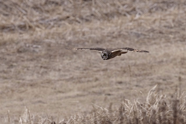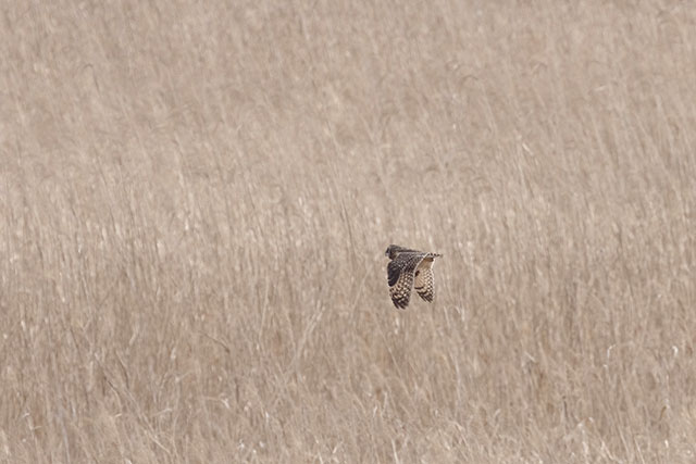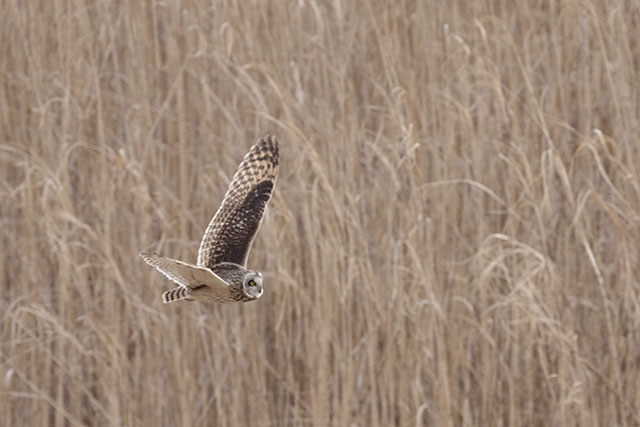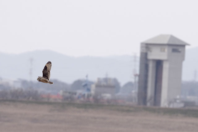 コウノトリがどこかへ行ってしまったので、巴波川方向へ移動することにした.移動途中の何気なく第二調節池の方向へ目をやると、土手の近くを低く飛んでいる大きめの鳥が目についた.あの特徴の有る模様と平べったい顔はまぎれもなくコミミズクだ.