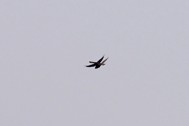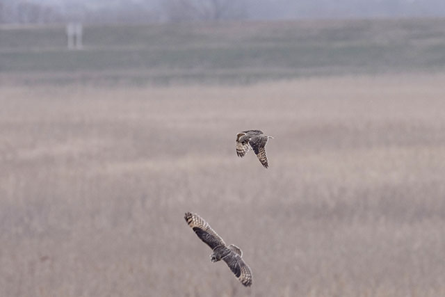 コミミズクは土手と平行に行ったり来たりを繰り返している.移動距離が結構長いので、コミミズクが飛行する度に土手の上を行ったり来たりしながら追いかける.コミミズクはカラスに喧嘩を仕掛けてバトルを繰り返していたところに、先ほどのチョウゲンボウも加わって三つ巴の空中戦が始まった.私の手持ちのProminer500mmレンズのマニュアルフォーカスでは激しいバトルにピントを合わせることができず、決定的な瞬間を撮り逃してしまった.やっぱオートフォーカスレンズが欲しいな...