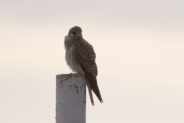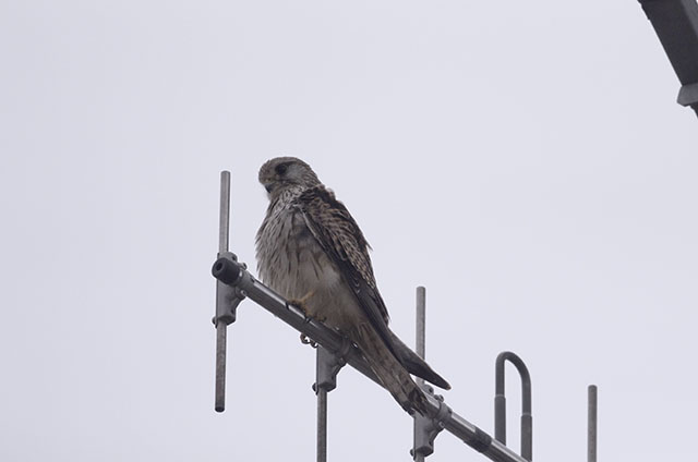 しばらくコウノトリの様子を観察していたら、土手の上でチョウゲンボウ君が、ホバリングを繰り返しながら餌を探していた.このチョウゲンボウ君はこの辺りを縄張りにしているようで、防災施設の八木アンテナが定位置のようだ.